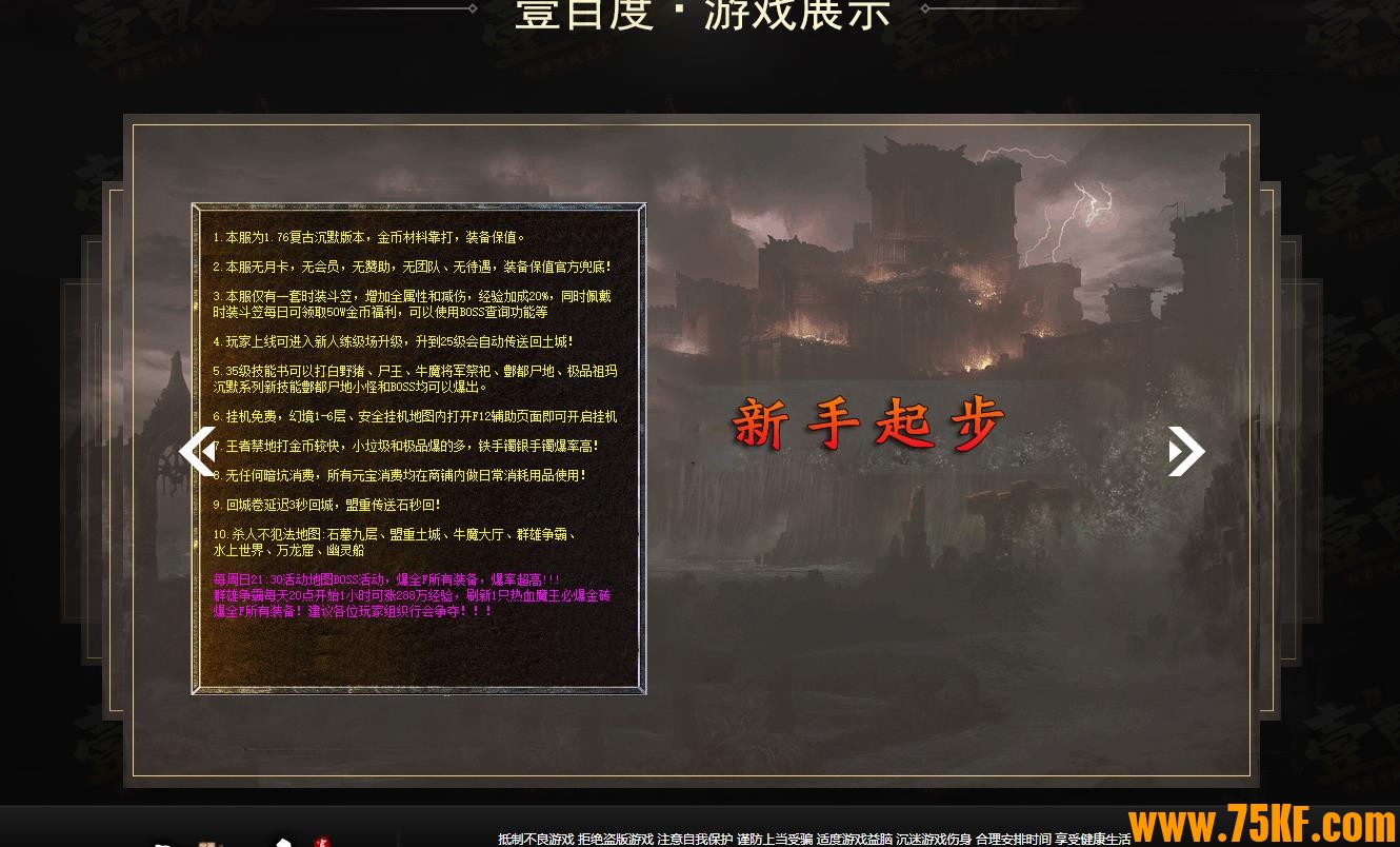 总之一句话:本服是个复古怀旧版本,这版本的特点是不氪金,耐玩!!那绝对不是现在那种快餐服,无脑服,坑钱服可比的,懂行的朋友可能明白,本服版本是2003年我本沉默剧情典藏版!不是本服吹牛,这版本,你百分之三百没玩过,如果你玩过这版本的服,游戏管理直播倒立四个小时给你看,因为这是从03年电脑里拿出来的原始无删减的版本,并不是你现在玩的那种上线就打怪,打装备,打元宝的机械服,本服有故事背景,有情节剧情,有世界观,本游戏你上线一看感觉很枯燥很单调,但是越玩越有内涵,越玩越有意思,不适合快餐型玩家,适合长期骨灰级!